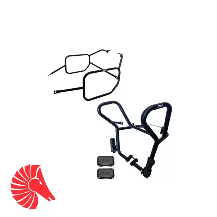 • Já o suporte afastador Alforge tem a função evita que os alforges se choquem com as carenagens, os amortecedores, escapamento e a roda traseira e absorver impactos laterais em caso de tombos e quedas.